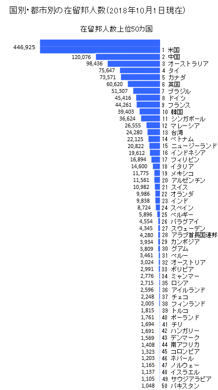 国別では、米国に全体の32%(42万9000人)、中国に8%(10万7000人)がそれぞれ在留。両国で在留邦人の4割を占めている。このほかオーストラリアに9万3000人、タイに8万2000人、カナダに7万人、英国に6万3000人、ブラジルに4万8000人、ドイツに4万2000人、韓国に4万1000人、フランスに3万6000人が住んでいる。