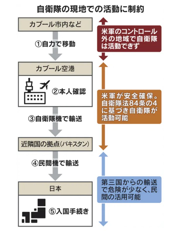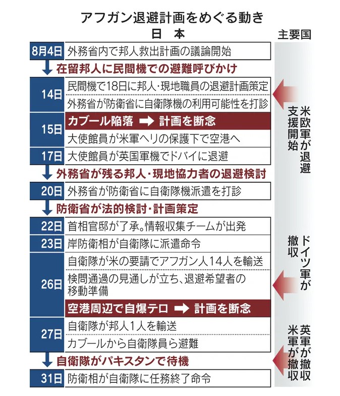 政府は17日までに日本人の大使館員や国際協力機構(JICA)職員、出国を望む邦人を第三国に退避させた。米軍と連携し、実際の移送では英国軍の協力を得た。このとき日本に過去20年間協力してきたアフガン人職員らは取り残された。