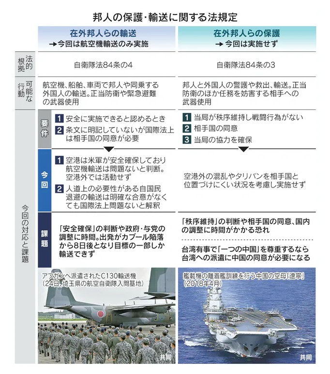 2016年施行の安全保障関連法で、新たに在外邦人らの救出や警護を認める「保護」(自衛隊法84条の3)が可能となり、より強い武器使用権限も与えられた。しかし、派遣先となる受け入れ国の同意や現地の治安が維持されていることが要件で、タリバンが支配するアフガンでの適用は見送った。