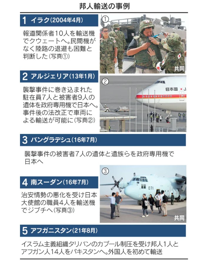 今回のように、治安情勢が悪化した海外で日本人の安全を確保するため、自衛隊法に基づき、自衛隊が輸送を行ったケースは、これまでに4回あります。