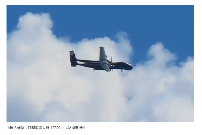 『防衛省は5日未明、4日午前から夜にかけて中国の偵察型無人機「BZK005」1機と偵察・攻撃型無人機「TB001」1機が沖縄県周辺を飛行したと発表した。中国の無人機と推定する他の1機も台湾北東沖の上空を旋回した。いずれも中国が設定した軍事演習の対象地域の空域を飛んだ。