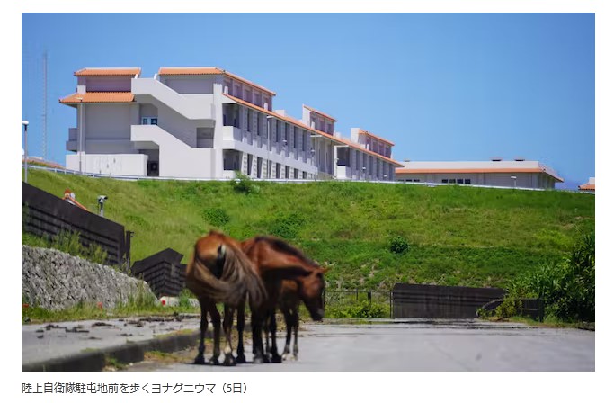 陸上自衛隊駐屯地前を歩くヨナグニウマ(5日)