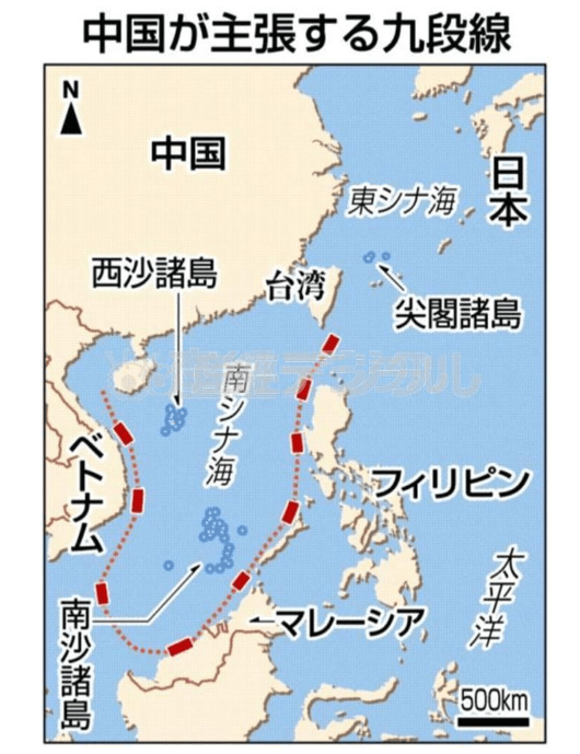 さらに、中国は国連の海洋法条約に加盟しているのですが、その条約では、沿岸国の基線(ほぼ海岸線)から200海里(約370km)以内を排他的経済水域(EEZ)として、資源や開発の権利を与えています。このように国際条約から見ても、中国沿岸から遠くはなれたところまで「中国の権利が及ぶ」はずがありません。(※九段線の最南端は、中国大陸から1000キロ以上も離れています)