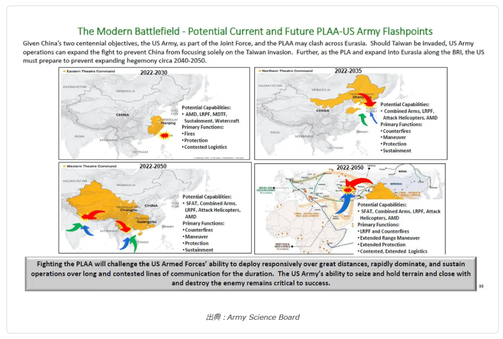 “人民解放軍や中国企業の研究開発に関する分析、長期的な技術開発に関するアプローチは将来の戦場が複数の次元や領域にまたがって拡大し『脅威が複雑さが飛躍的の増大する』と示唆している。戦闘が局地的な目標を巡って争われることに変わりはないものの、紛争や戦争は世界規模の影響と結果が伴うようになるだろう。特に注目すべきは戦場の時間域が拡大していない点で、情報、認識、兵器システムなどのスピードアップに伴い戦場での意志決定は迅速化が迫られている”