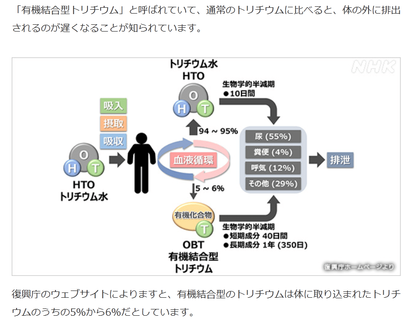 「有機結合型トリチウム」と呼ばれていて、通常のトリチウムに比べると、体の外に排出されるのが遅くなることが知られています。復興庁のウェブサイトによりますと、有機結合型のトリチウムは体に取り込まれたトリチウムのうちの5%から6%だとしています。