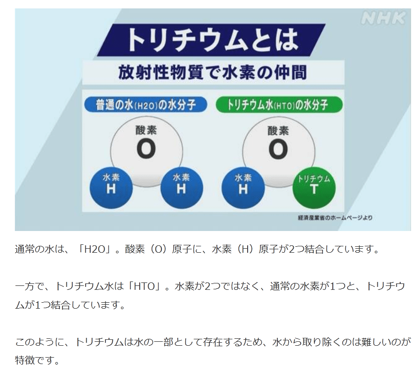 一方で、トリチウム水は「HTO」。水素が2つではなく、通常の水素が1つと、トリチウムが1つ結合しています。