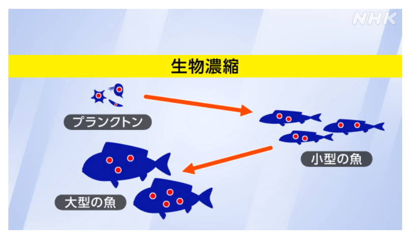 海の生物の場合、プランクトンを小さな魚が食べ、その魚をさらに大きな魚が食べるという食物連鎖を経て、ある物質がより大きな魚にたまっていくという現象です。