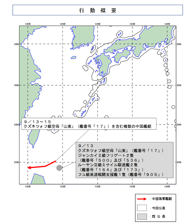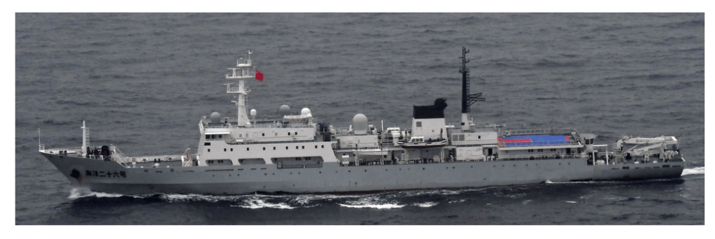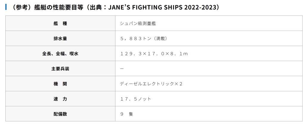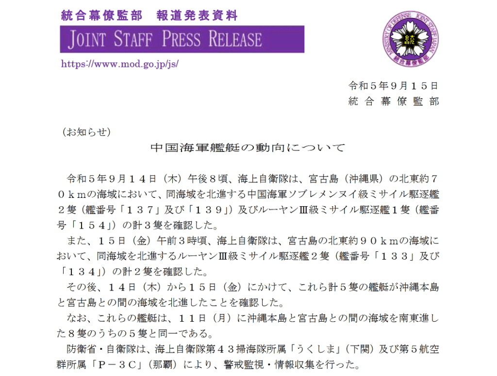 『令和5年9月15日(金)午後7時00分頃、海上自衛隊は、屋久島(鹿児島県)南東の我が国の接続水域を西進する中国海軍シュパン級測量艦1隻(艦番号「26」)を確認し、同日(金)午後10時08分頃、当該測量艦が口之島(鹿児島県)北東の我が国領海に入域したのを確認しました。