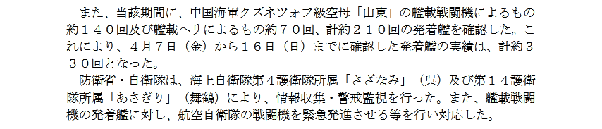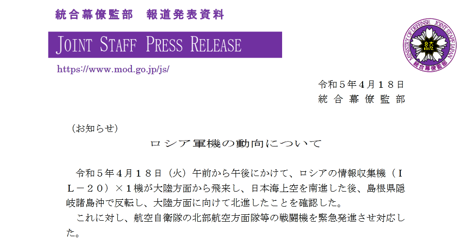 日本の防衛省はその後、日本海上空にいロシアの情報収集機に対応するため、航空自衛隊の戦闘機を緊急発進させたと発表した。』