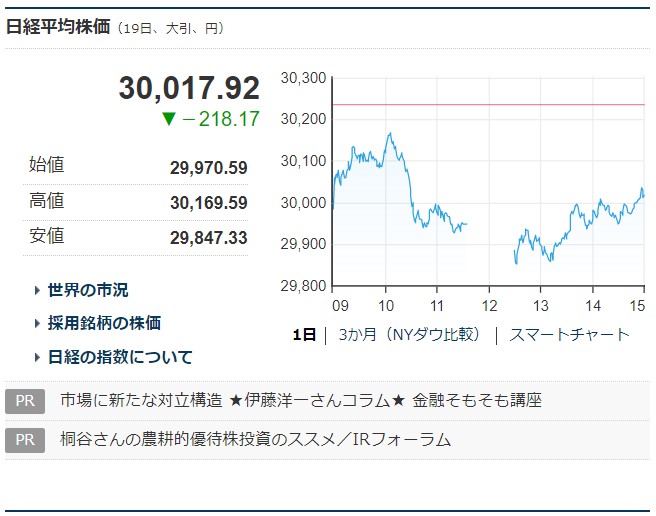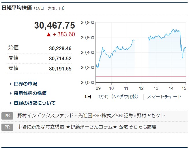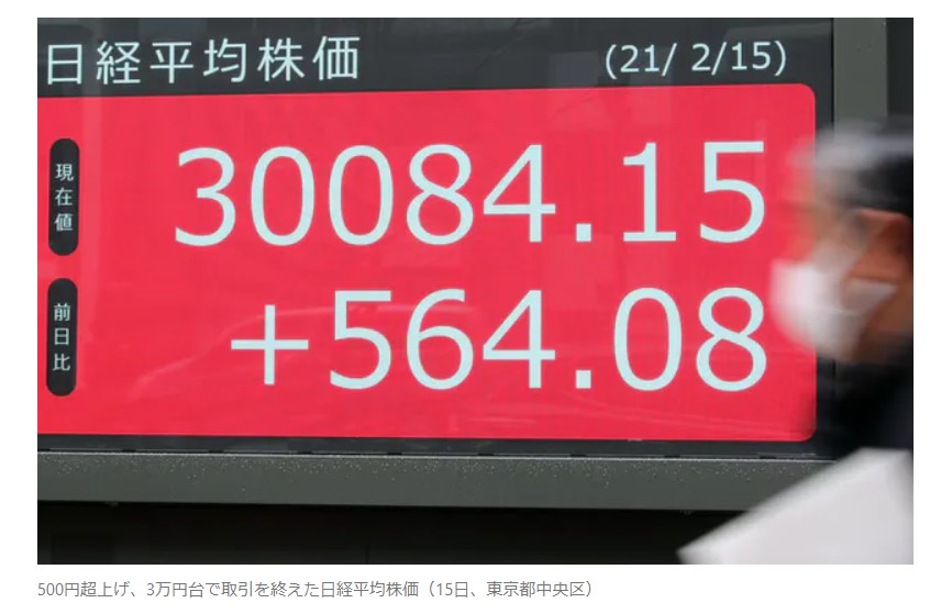一時は上げ幅が400円を超えて3万458円に達し、16日に付けた終値ベースでの30年半ぶり高値(3万467円)に迫る場面もあった。ただ、午後の取引を始めると急速に伸び悩み、一時は3万100円を割り込む場面もあった。