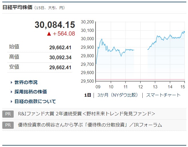 22日の東京市場で日経平均株価は232円(0.78%)高の3万250円で午前の取引を終えた。一時は上げ幅が400円を超えて3万458円に達…