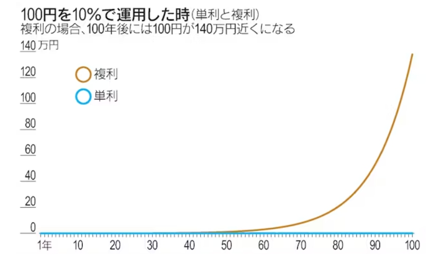 このように複利で運用すれば、単利での運用に比べ、長い年月の間に運用成績で大きな差がつく。年と共に利息が増えていく様子をグラフ化すると、単利は直線的なグラフになるが、複利は年が経つにつれて利息が指数関数的に増えていくグラフになる。