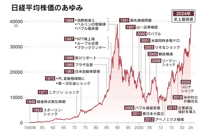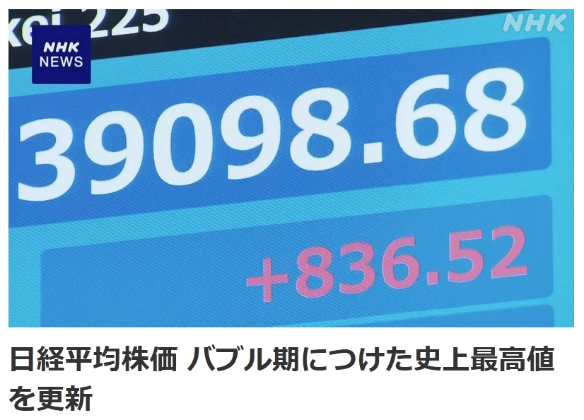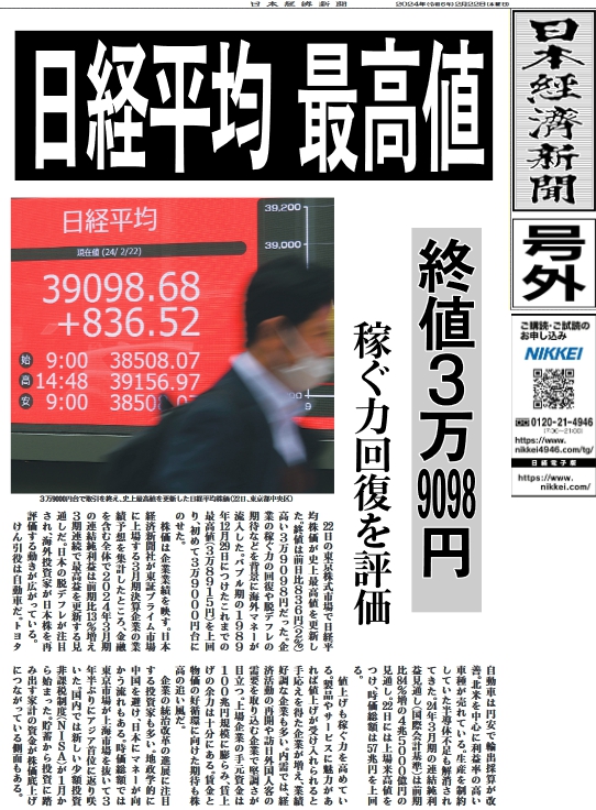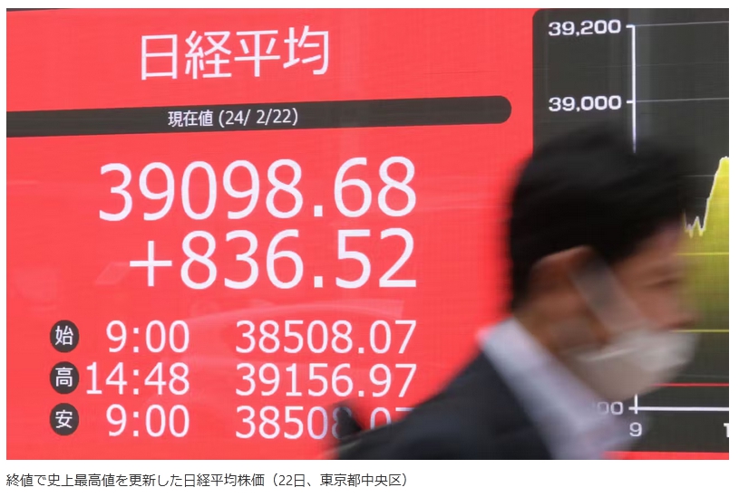 『日経平均株価が22日、終値が3万9098円を付けて34年ぶりに最高価格を更新した。バブル絶頂期の1989年12月29日の大納会の3万8915円を付けたあと、年明けの取引開始から暴落に転じた日本の株価が失われた30年を取り戻しかにみえる。