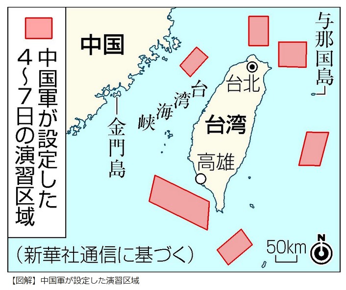 『【北京=羽田野主、台北=龍元秀明】中国人民解放軍が台湾周辺の6カ所の空・海域で実施する軍事演習が4日始まった。期間は7日まで4日間。演習エリアは沖縄県の与那国島や波照間島からわずか60キロメートルの距離に設定され、中国軍が発射した弾道ミサイルは日本の排他的経済水域(EEZ)に落下した。台湾を巡る緊張が日本にも波及した。