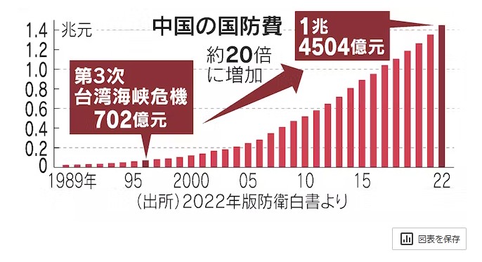 日本政府内には「台湾有事は日本にとっても有事だ」という認識が広がりつつある。EEZへのミサイル落下でその懸念がさらに強まった。中国の軍事力は飛躍的に増強した。2022年の中国の国防予算は1兆4504億元と、1996年に比べて約20倍だ。