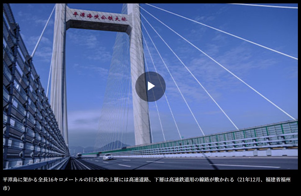 21年3月11日、全国人民代表大会(全人代)の最終日。中国政府はその平潭に至る橋をさらに延伸させ、台湾の本島にまでつなげる建設計画案を可決した。無論、台湾側は了承などしていない。 平潭島に架かる全長16キロメートルの巨大橋の上層には高速道路、下層は高速鉄道用の線路が敷かれる(21年12月、福建省福州市)