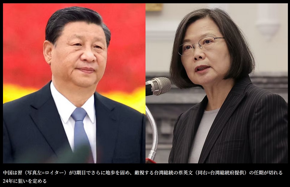 中国は習(写真左=ロイター)が3期目でさらに地歩を固め、敵視する台湾総統の蔡英文(同右=台湾総統府提供)の任期が切れる24年に狙いを定める