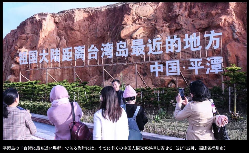 平潭島の「台湾に最も近い場所」である海岸には、すでに多くの中国人観光客が押し寄せる(21年12月、福建省福州市)