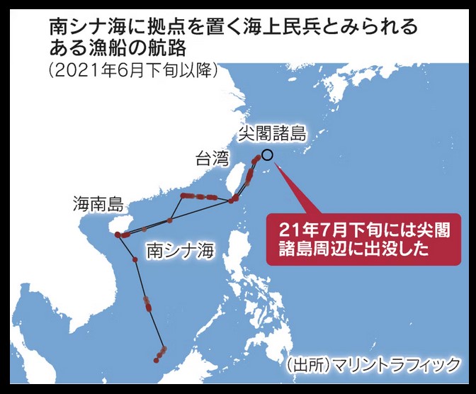 日本経済新聞がこれらの船舶情報をもとに、世界中の船の位置情報を提供するサイト「マリントラフィック」で海上民兵船の過去1年間の挙動を追ったところ、12隻が台湾や尖閣周辺を航海していたことが分かった。南シナ海以外にも影響力を拡大しようとしている狙いが透ける。