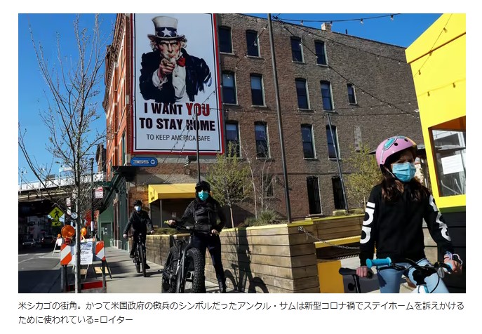 米シカゴの街角。かつて米国政府の徴兵のシンボルだったアンクル・サムは新型コロナ禍でステイホームを訴えかけるために使われている=ロイター