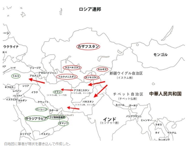 赤で囲んだ中央アジア5ヵ国は、1991年12月26日にソ連が崩壊した後、1週間の間に中国が駆け巡って国交を結んだ国々だ。石油パイプラインの提携国であると同時に、ロシアも入れた上海協力機構という安全保障の枠組みの重要構成メンバーでもある。