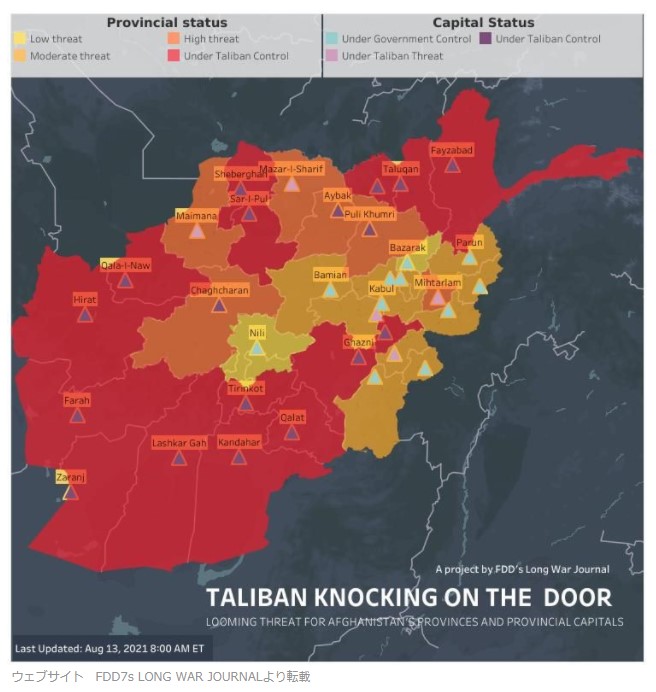 赤はタリバンの占領地域で、濃いオレンジは危険地域(タリバンが優勢な地域)、薄いオレンジは中程度に危険な地域で、黄色が危険性の低い地域、すなわちアフガニスタン政府側が何とか勢力を保っている地域である。黄色は一か所しかないので、ほぼタリバンによって制圧されていると言っていい。