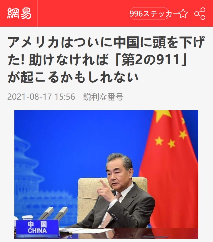 同紙編集長も、「アフガン政権が崩壊し、台湾当局は震えあがっているはずだ。アメリカが守ってくれると期待してはいけない。台湾当局はつべこべ言わずに五星紅旗(中国国旗)を中国大陸から通販で取り寄せる必要がある。いつかPLA(中国人民解放軍)に降伏するときに役立つだろう」とツイートした。