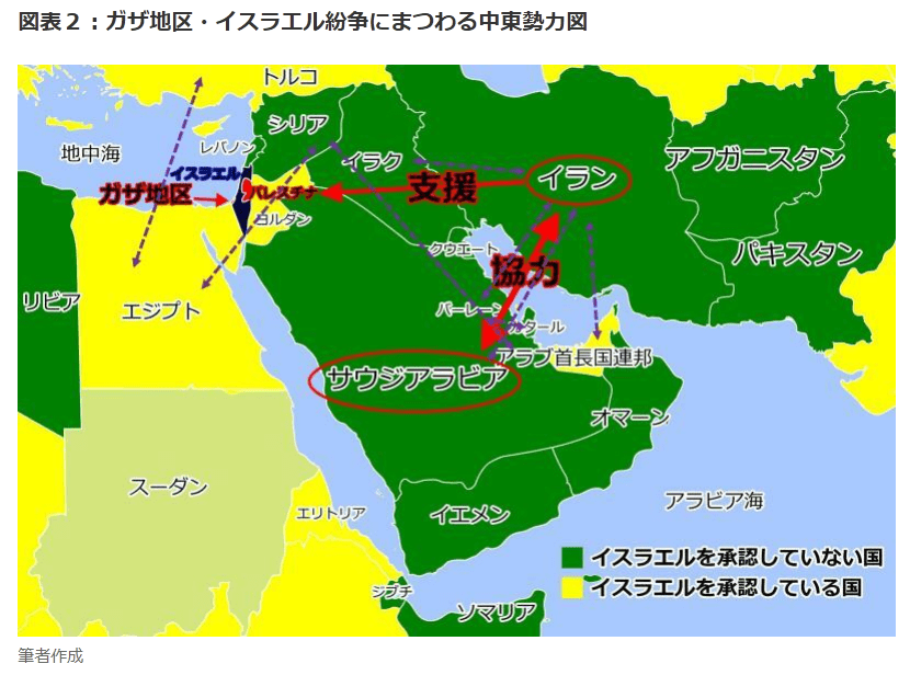パレスチナのガザ地区とイスラエルの紛争に関しては、まずイランがパレスチナ側を支援し、サウジはそのイランと協力関係にある。