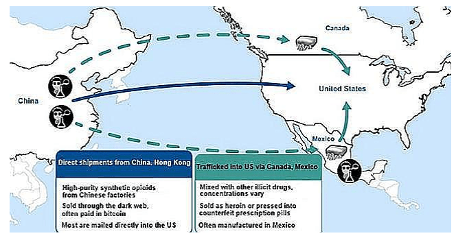メキシコのカルテル、特にシナロアとハリスコのカルテルは、(中国の犯罪組織)三合会と提携 Sinaloa and Jalisco ones, have partnered with the Chinese Triadして、フェンタニル前駆体(原料)を中国からメキシコに輸送しており、そこでは致死性物質が製造されており、その際には頻繁に中国の化学者の協力を得ている。