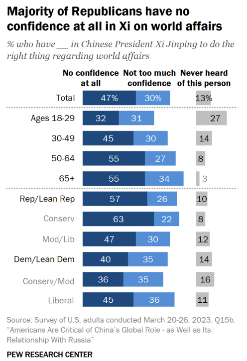 中国国家主席への信頼度は党派によっても異なり、共和党員の57%が習主席をまったく信頼していないのに対し、民主党員は40%である。共和党支持者の中では、保守派が習主席に全く自信がない傾向が最も高い(63%)が、穏健派やリベラル派(47%)を上回っている。また、民主党員の間では、リベラル派は保守派や穏健派(45%)よりも習主席(36%)に対する全体的な信頼感が低い傾向があります。