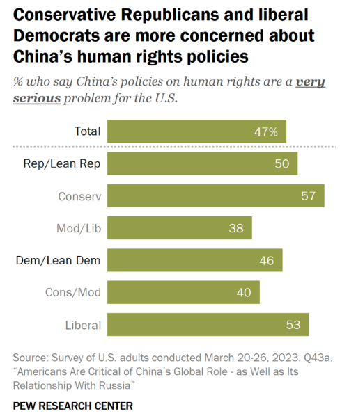 共和党員は民主党員よりも中国の人権政策を非常に深刻な問題と見なす可能性が高いが、各党内には大きな違いがある。保守的な共和党員とリベラルな民主党員はどちらも、より穏健な共和党員よりも、中国の人権政策を非常に深刻な問題と見なす可能性が高い。