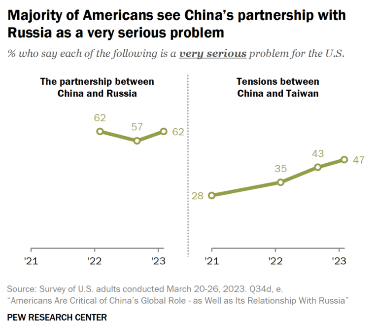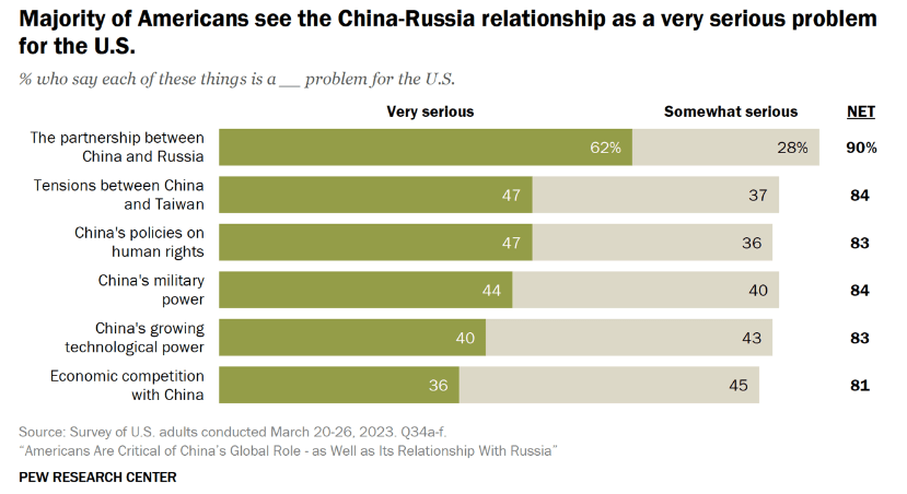 人々は、地政学的にも特定の問題の観点からも、世界における中国の役割について広く懸念しています。例えば、中国の習近平国家主席がロシアのウラジーミル・プーチン大統領と会うためにモスクワを最近訪問したことを受けて、アメリカ人の62%が中露パートナーシップを米国にとって非常に深刻な問題と見なしており、5月から2022ポイント上昇し、<>年のウクライナ侵攻直後に見られた元の高水準に戻った。』