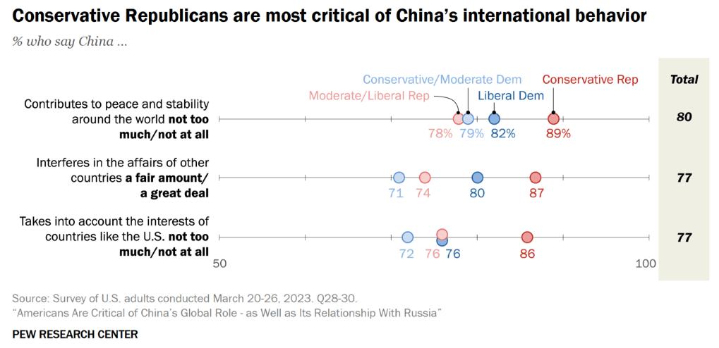 アメリカ人の大多数(77%)は、中国が外交政策の決定を行う際に米国のような他の国の利益をほとんど重視していないと述べ、<>分の<>は中国が他国の利益をまったく考慮していないと述べています。保守的な共和党員は、穏健な共和党員や民主党員よりも、年配のアメリカ人やより多くの教育を受けた人々と同様に、この見解を保持する可能性が高くなります。