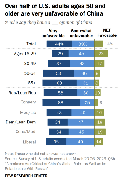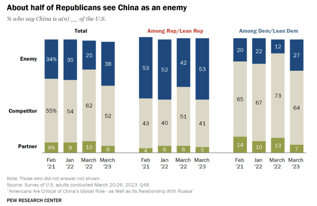 米国の成人の大多数(83%)は引き続き中国に対して否定的な見方をしており、非常に好ましくない見方をしている人の割合(44%)は昨年から4ポイント増加しています。13年20月26〜2023日のピュー研究所の調査によると、アメリカ人の約<>人に<>人が中国を競争相手やパートナーではなく米国の敵と表現しており、昨年から<>ポイント上昇しています。
