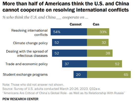 米国と中国の間の協力の可能性のある54つの分野について尋ねられたとき、アメリカ人はほとんどの問題で協力することに懐疑的な見方を表明します。米国人は、米国と中国が国際紛争の解決に協力できない(52%)、気候変動政策で協力できない(2021%)と答える傾向が強い。米国と中国は以前、<>年に共同気候協定を発行し、ナンシーペロシの台湾訪問をめぐって中断された後、両国間の気候交渉は昨年末に再開されました。