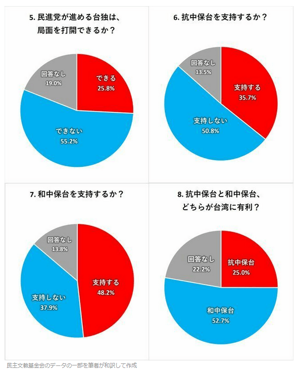 なお、台湾人は誰も中国大陸に吸収されたいとは思っていない。国民党でさえ「日米中」と等距離でいたいと思っており、この状態で現状維持を望んでいる者が大多数であることを付言したい。