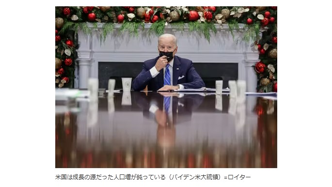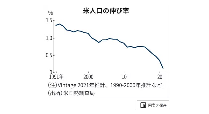 『【ワシントン=大越匡洋】米国勢調査局が21日発表した2021年7月1日時点の人口推計によると、米人口は1年間で0.1%増え、3億3189万3745人となった。同局は「増加率は過去最低」としている。高齢化の進展と出生数の低迷で自然増が鈍り、移民の流入も細った。人口鈍化を上回る生産性の向上がなければ経済成長の土台が揺らぐ。