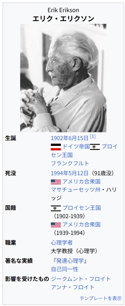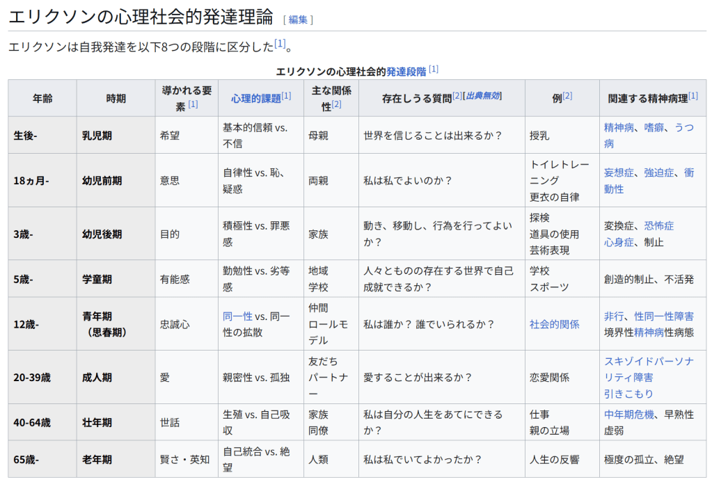 ^ a b c d e f g h i B.J.Kaplan; V.A.Sadock『カプラン臨床精神医学テキスト DSM-5診断基準の臨床への展開』(3版)メディカルサイエンスインターナショナル、2016年5月31日、Chapt.4。ISBN 978-4895928526。 ^ a b c Macnow, Alexander Stone, ed (2014). MCAT Behavioral Science Review. New York City: Kaplan Publishing. p. 220. ISBN 978-1-61865-485-4 ^ “Stages of Social-Emotional Development – Erik Erikson”. childdevelopmentinfo.com. Child Development Institute. 2015年5月8日閲覧。 ^ a b Allen, Eileen; Marotz, Lynn (2003). Developmental Profiles Pre-Birth Through Twelve (4th ed.). Albany, NY: Thomson Delmar Learning. ISBN 978-0-7668-3765-2 ^ Crain, William (2011), Theories of Development: Concepts and Applications (6th ed.), Upper Saddle River, NJ: Pearson Education, Inc., ISBN 978-0-205-81046-8 ^ Gross, Francis L. (1987), Introducing Erik Erikson: An Invitation to his Thinking, Lanham, MD: University Press of America, p. 47, ISBN 0-8191-5788-0 ^ Wright, Jr, J. Eugene (1982). Erikson: Identity and Religion. New York, NY: Seabury Press. p. 73. ISBN 0-8164-2362-8 ^ Stevens, Richard (1983). Erik Erikson: An Introduction. New York, NY: St. Martin’s Press. pp. 48–50. ISBN 978-0-312-25812-2 ^ 清水書院『用語集 現代社会+政治・経済’12-’13年版』6ページ