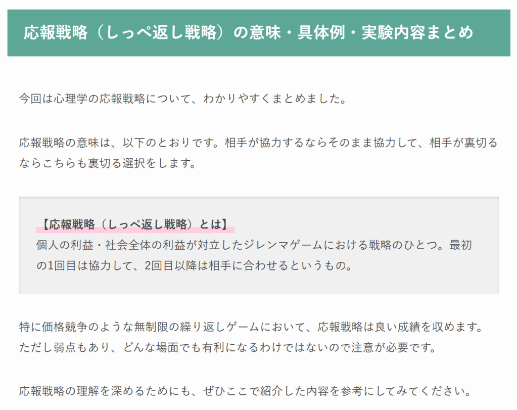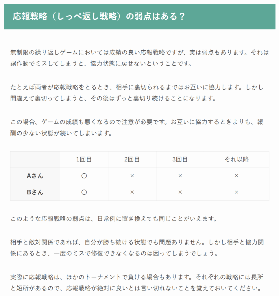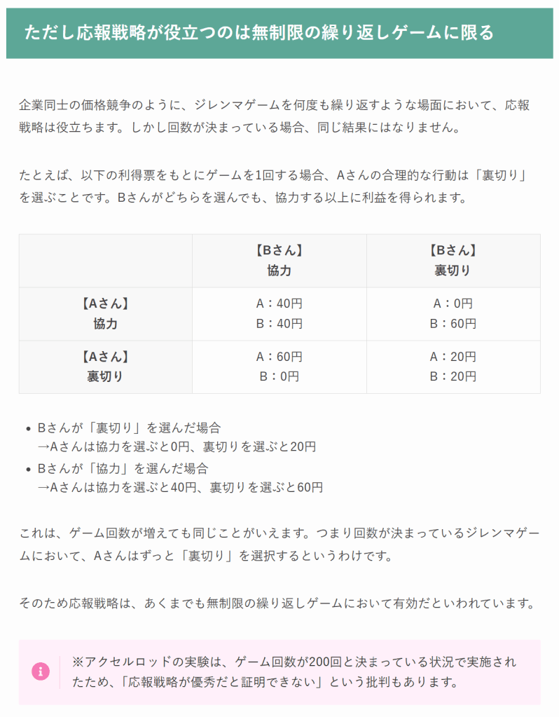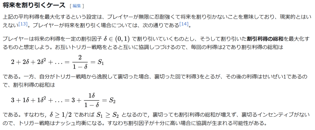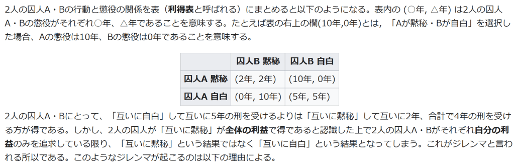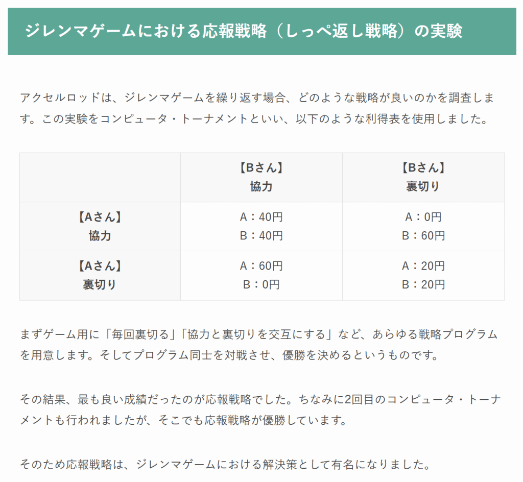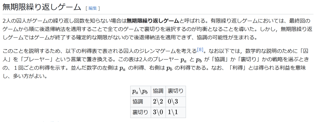 ^ 渡辺 (2008, pp. 25–27)。 ^ a b 岡田 (2008, p. 87、pp.102–103)。 ^ 岡田 (2008, p. 88)。 ^ Osborne & Rubinstein (1994, p. 30) ^ 岡田 (2008, p. 102)。 ^ 岡田 (2008, pp. 87–88)。量刑などの細かい設定は異なる。 ^ 渡辺 (2008, pp. 296–301)。 ^ 利得表の数値はビンモア (2015, p. 98)図7による。 ^ ビンモア (2015, p. 16)。 ^ ビンモア (2015, pp. 121–123)。またはBinmore (2004)、7. Folk theorem。 ^ 岡田 (2008, pp. 144–147)。 ^ 岡田 (2008, pp. 147–151)。 ^ a b ビンモア (2015, p. 124)。またはBinmore (2004)の”What can go wrong?”の節。 ^ 岡田 (2008, pp. 135–146)。 ^ 神取 (2015, p. 55)。 ^ 神取 (2015, p. 58)。 ^ a b 神取 (2015, p. 59)。 ^ 神取 (2015, p. 61)。 ^ 神取 (2015, p. 69)。 ^ a b 神取 (2015, p. 72)。 ^ a b c 神取 (2015, p. 75)。 ^ 神取 (2015, pp. 78–79) ^ シグムンド (1996, p. 384)。 ^ 青木 (2003, pp. 67–70)。以下この段落はこれによる。 ^ この段落はビンモア (2015, p. 119)およびBinmore (2004)の”Axelrod’s Olympiad”を参照した。アクセルロッド本人の著書はアクセルロッド (1998)(原著1984年)である。 ^ a b 神取 (2015, p. 30)。 ^ Binmore (1998)で引用される J. Martinez-Coll and J. Hirshleifer (1991)”The limits of reciprocity”Rationality and Society 3, p35-64。 ^ 神取 (2015, pp. 30–31)。著名なゲーム理論研究者「M教授」の意見を神取が解釈したもの。 ^ Binmore (1998)で紹介される J. Nachbar (1992) “Evolution in the finitely repeated Prisoners’ Dilemma,” Journal of Economic Behavior and Organization 19, p307-326。 ^ a b ビンモア (2015, pp. 119–120)およびBinmore (2004)の”Axelrod’s Olympiad”。 ^ a b c Binmore (1998)。ケン・ビンモア. 「アクセルロッド『対立と協調の科学』書評:「しっぺ返し」はそんなにすごいものではありません」. ELSE, Economics Department, University College London. (1998, JASSS vol 1, no 1.). ^ 光辻克馬 (2016年9月16日). “囚人のジレンマ選手権モデル”. 構造計画研究所. 2017年5月23日閲覧。 ^ グライフ (2009, pp. 354–361) ^ 山岸 (2000, pp. 48–49)。 ^ 山岸 (2000, pp. 17–18)。 ^ 武藤 (2005)。 ^ 武藤 (2005)で紹介される Raub,W.,(1988) “problematic Social Situation and the Large Number of Dilemma: A Game-theoretical Analysis,” Journal of Mathematical Sociology 13(4), pp311-357や、永田えりこ(1988)「自由と効率」『方法と理論』3(1),pp43-56。 ^ 武藤 (2005)で紹介される Taylor,M.(1987)Possibility of Cooperation, Cambridge University Pressや、木村邦博(2002)『大集団のジレンマ』ミネルヴァ書房。 ^ Nowak (2006)の Direct Reciprocity 。以下この節はこれによる。 参考文献 A.ラパポート, A.M.チャマー 著、廣松毅, 平山朝治, 田中辰雄 訳『囚人のジレンマ―紛争と協力に関する心理学的研究』啓明社、1983年1月。ISBN 978-4906143078。 青木昌彦 著、滝沢弘和・谷口和弘 訳『比較制度分析に向けて』(新装版)NTT出版、2003年10月。ISBN 978-4-7571-2119-5。 アクセルロッド, ロバート 著、松田裕之 訳『つきあい方の科学――バクテリアから国際関係まで』ミネルヴァ書房〈Minerva21世紀ライブラリー〉、1998年5月。ISBN 4-623-02923-9。 原書 Axelrod, Robert (October 1984). The Evolution of Cooperation. Basic Books. ISBN 0465021212 岡田章『ゲーム理論・入門――人間社会の理解のために』有斐閣〈有斐閣アルマ〉、2008年8月。ISBN 978-4-641-12362-5。 神取道宏『人はなぜ協調するのか―くり返しゲーム理論入門―』三菱経済研究所、2015年7月。ISBN 978-4-943852-56-8。 グライフ, アブナー 著、岡崎哲二・神取道宏 監 訳『比較歴史制度分析』NTT出版〈叢書 制度を考える〉、2009年12月。ISBN 978-4-7571-4124-7。 シグムンド, カール 著、富田勝 訳『数学でみた生命と進化――生き残りゲームの勝者たち』講談社〈講談社ブルーバックス〉、1996年3月(原著1993年)。ISBN 978-4-06-257111-1。 ビンモア, ケン 著、栗林寛幸 訳『正義のゲーム理論的基礎』NTT出版〈叢書《制度を考える》〉、2015年5月。ISBN 978-4-7571-2233-8。 原書 Binmore, K. (2005). Natural justice. Oxford University Press. ISBN 978-0-19-517811-1 武藤正義 (2005年). “社会的ジレンマと協力概念:フリーライドの視点によるN人ゲームの構造分析I”. 『秩序問題への進化ゲーム理論的アプローチ』(科学研究費補助金研究成果報告書). pp. 75–97. date=2015年11月閲覧。 山岸俊男『社会的ジレンマ―「環境破壊」から「いじめ」まで』PHP研究所〈PHP新書〉、2000年6月。ISBN 978-4-5696-1174-7。 渡辺隆裕『ゼミナール ゲーム理論入門』日本経済新聞出版社、2008年4月。ISBN 978-4-532-13346-7。 Binmore, K. (1998). “Book Review: The Complexity of Cooperation by Robert Axelrod”. Journal of Artificial Societies and Social Simulation 1 (1). 山形浩生. “アクセルロッド『対立と協調の科学』書評:「しっぺ返し」はそんなにすごいものではありません”. 2024年9月7日閲覧。 Binmore, K. (2004). “Reciprocity and the Social Contract”. Politics, Philosophy and Economics (SAGE Publications Ltd) 3 (1): 5–35. ※ビンモア(2015)の原著 Binmore (2005) Natural Justice の抜粋。 Nowak, M. (2006). “Five Rules for the Evolution of Cooperation”. Science (www.sciencemag.org) 314: 1560-1563. Osborne, M.; Rubinstein, A. (1994). A course in game theory. MIT Press. ISBN 0-262-65040-1. MR1301776. Zbl 1194.91003 関連項目 フォーク定理 合成の誤謬 スタグハントゲーム 複占 3囚人問題 外部リンク Prisoner’s Dilemma (英語) – スタン