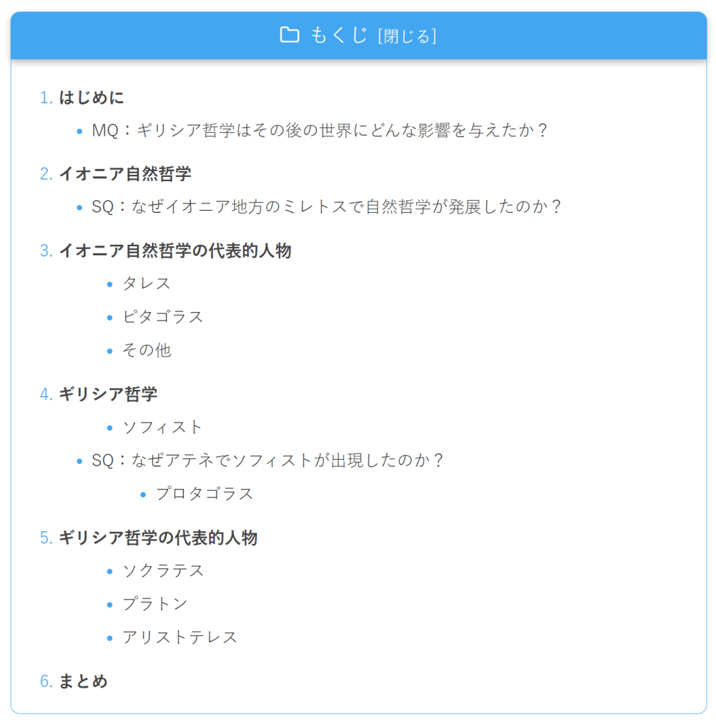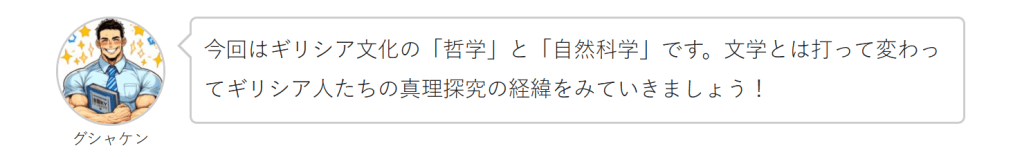 今回はギリシア文化の「哲学」と「自然科学」です。文学とは打って変わってギリシア人たちの真理探究の経緯をみていきましょう!MQ:ギリシア哲学はその後の世界にどんな影響を与えたか?