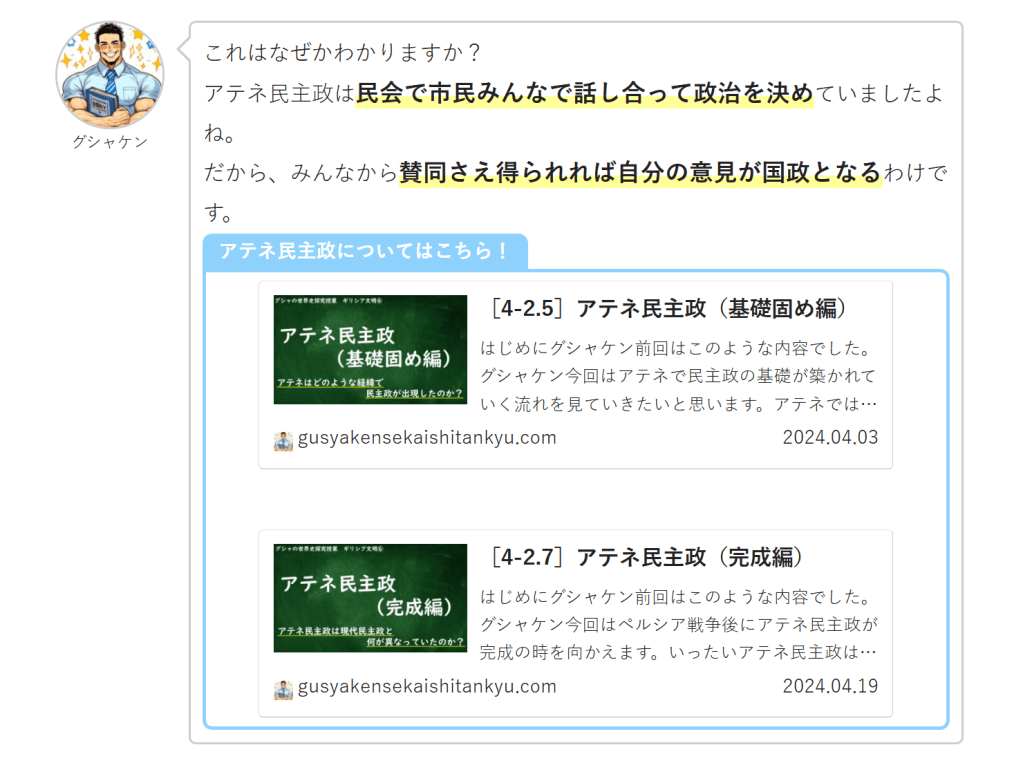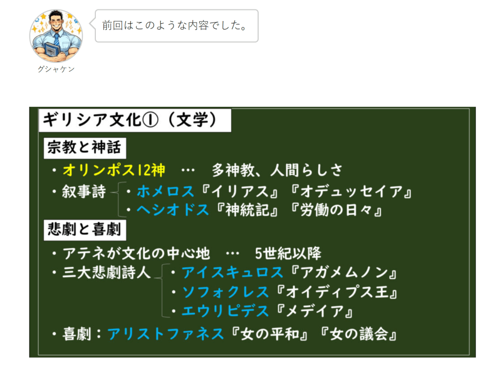 はじめにグシャケン前回はこのような内容でした。グシャケン今回は以前に出てきた「ポリス」でギリシア人たちはどんな生活をしていたのか、についてやっていきます。それでは一緒にみていきましょう!MQ:ポリスでギリシア人はどんな生活をしていたのか?今…