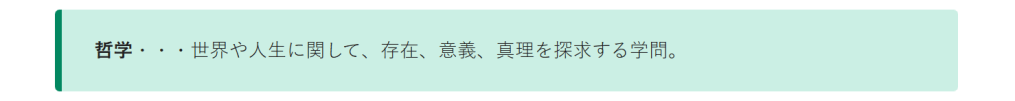 哲学・・・世界や人生に関して、存在、意義、真理を探求する学問。