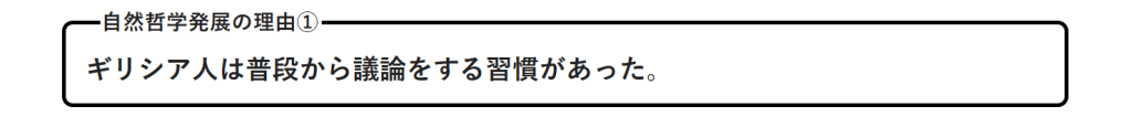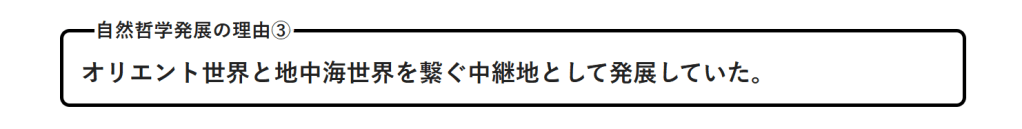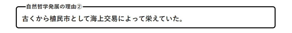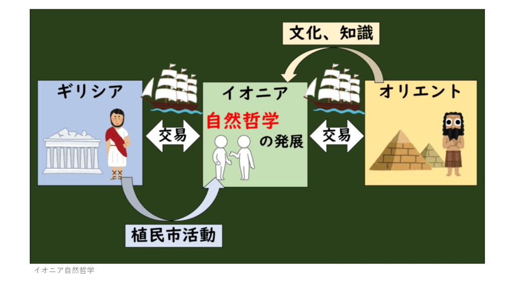 議論を習慣とするギリシア人が、植民市ミレトスがオリエント世界との海上交易によって発展し、文化や知識の交流が盛んになったことから自然哲学が発展した。