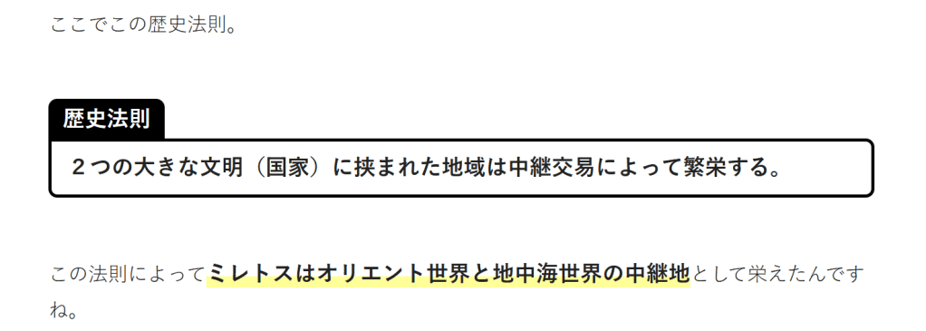2つの大きな文明(国家)に挟まれた地域は中継交易によって繁栄する。この法則によってミレトスはオリエント世界と地中海世界の中継地として栄えたんですね。