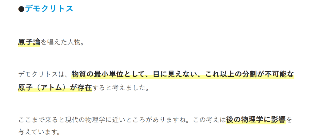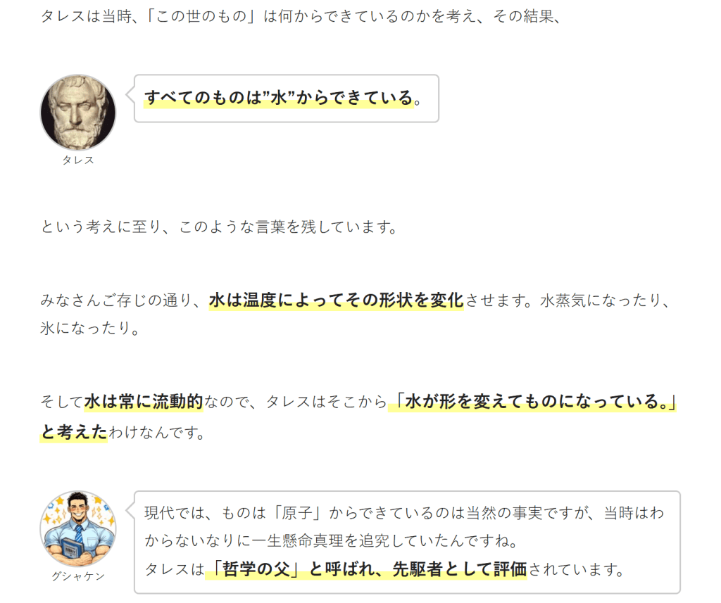現代では、ものは「原子」からできているのは当然の事実ですが、当時はわからないなりに一生懸命真理を追究していたんですね。タレスは「哲学の父」と呼ばれ、先駆者として評価されています。