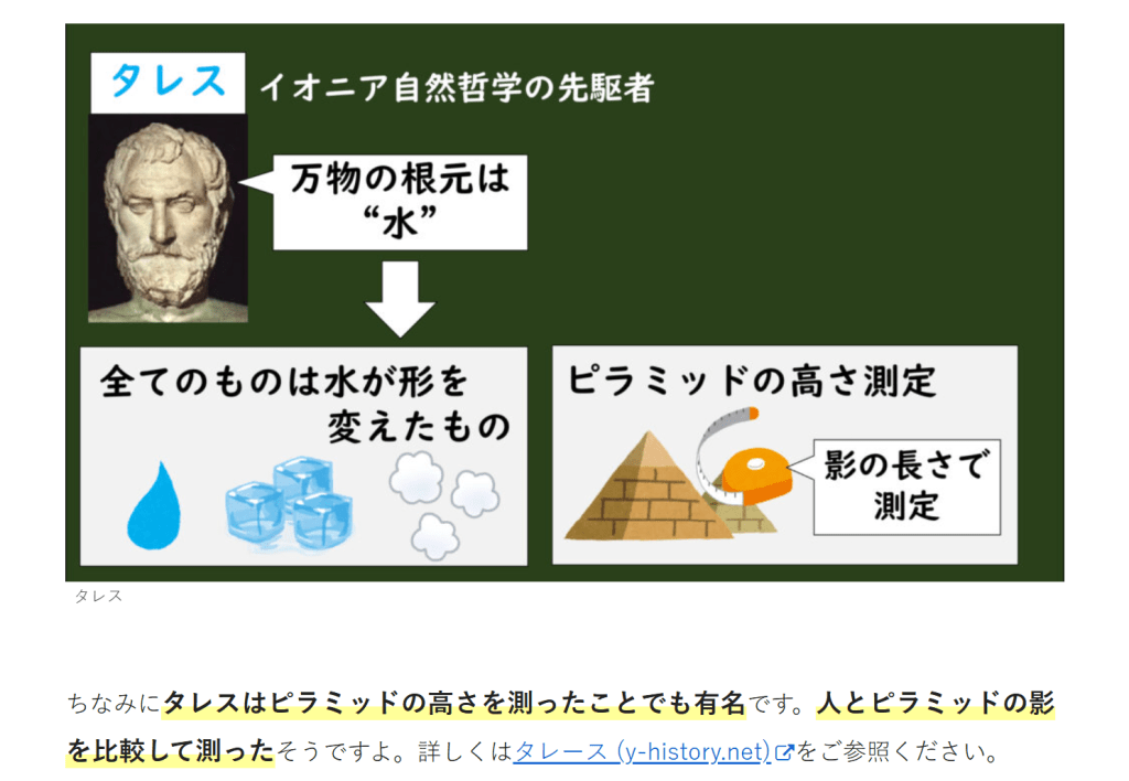 ちなみにタレスはピラミッドの高さを測ったことでも有名です。人とピラミッドの影を比較して測ったそうですよ。詳しくはタレース (y-history.net)をご参照ください。ピタゴラス