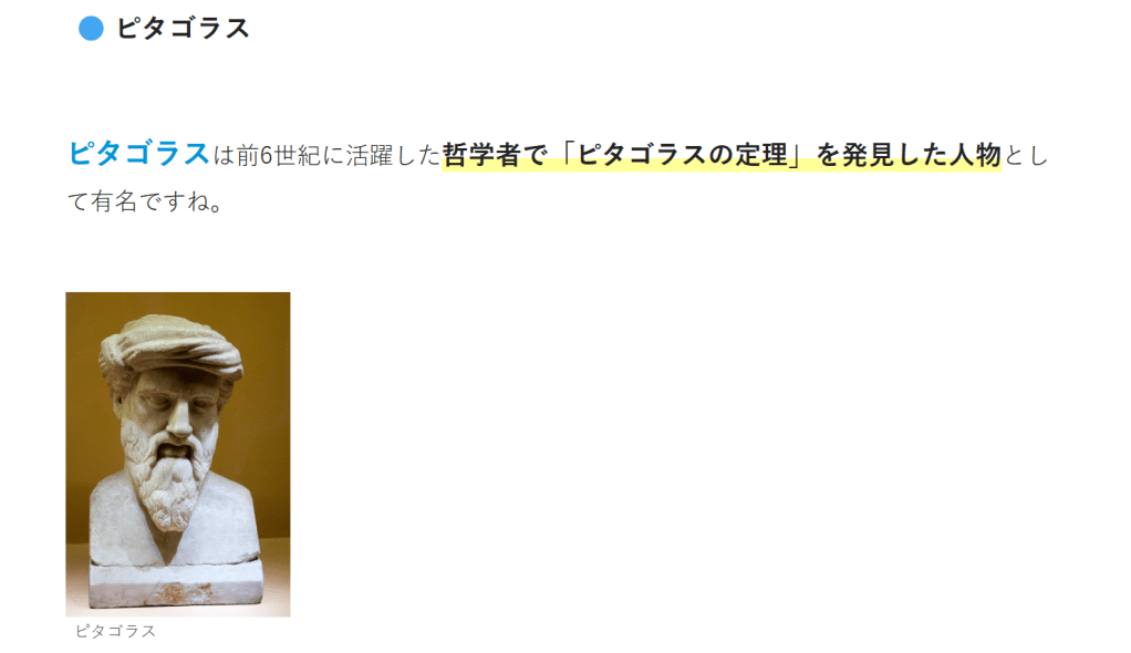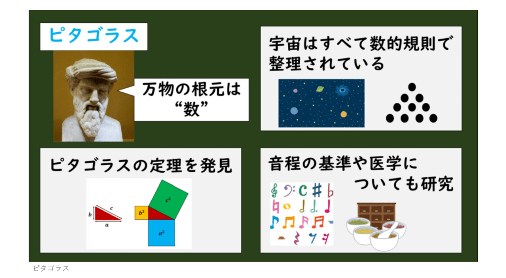ピタゴラスは前6世紀に活躍した哲学者で「ピタゴラスの定理」を発見した人物として有名ですね。ピタゴラス