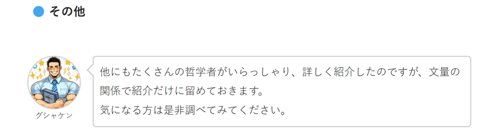 他にもたくさんの哲学者がいらっしゃり、詳しく紹介したのですが、文量の関係で紹介だけに留めておきます。気になる方は是非調べてみてください。