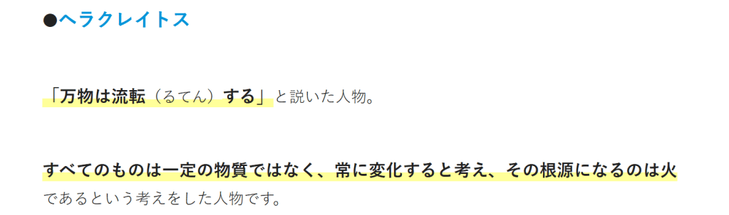 すべてのものは一定の物質ではなく、常に変化すると考え、その根源になるのは火であるという考えをした人物です。