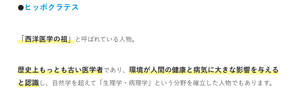 歴史上もっとも古い医学者であり、環境が人間の健康と病気に大きな影響を与えると認識し、自然学を超えて「生理学・病理学」という分野を確立した人物でもあります。